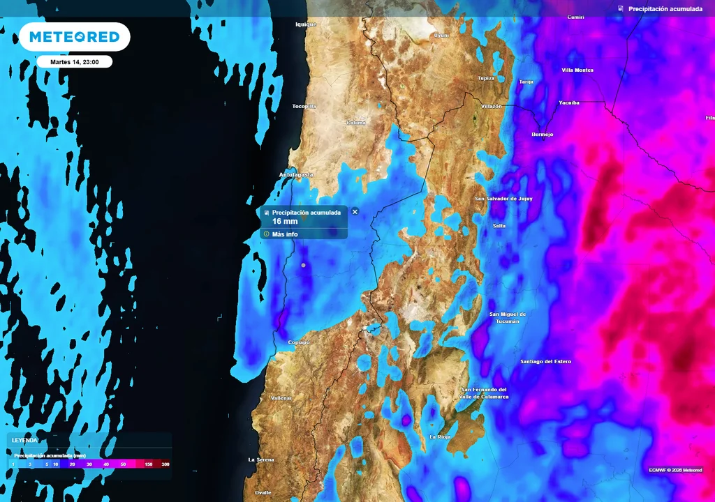 Según Metrored, los montos de precipitación podrían alcanzar entre 15 y 20 mm en zonas puntuales. Además, el sistema podría generar tormentas eléctricas y precipitaciones de nieve en sectores cordilleranos.